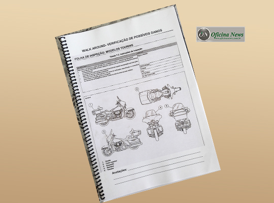 1- Quando a motocicleta chega num posto de serviço da marca, a primeira atitude do técnico, além de receber e atender muito bem o cliente, é claro, é fazer o que a marca chama de Walk Around, ou seja, uma verificação de possíveis danos no veículo. O técnico anota tudo numa folha de inspeção. Qualquer detalhe é importante afinal, o cliente da marca é exclusivo e observador. Neste mesmo documento, é inserido a identificação da moto.