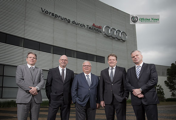 Da esquerda para a direita, Peter Will, Diretor de Manufatura da planta; Dr. Georg Richartz, Diretor de Produção Internacional da marca; Prof. Dr. Ing. Hubert Waltl e Dr. Bernd Martens, membros do board da AUDI AG para produção e compras; e Jörg Hofmann, Presidente e CEO da Audi do Brasil