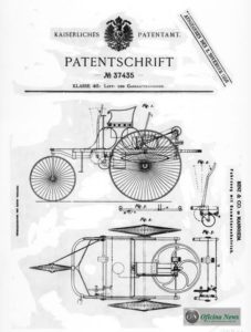 Esquisito, tipo cruza de triciclo com carroça, soluções mecânicas hoje risíveis, feito em ferramentas primárias, este é o veículo auto móvel patenteado pelo engenheiro Carl Friedrich Benz aos 29 de janeiro de 1886. Foi a primeira patente para um, digamos com boa vontade, automóvel movido por combustível de nome e funções estranhas, o Lidoin, derivado de petróleo empregado em limpeza doméstica.