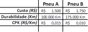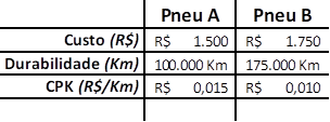 Para ilustrar o cálculo imagine dois pneus: o A e o B. Se o pneu A teve um custo total de R$ 1.500 e percorreu 100.000 km, seu CPK será R$ 0,015. Já se o pneu B teve um custo total de R$ 1.750 e percorreu 175.000 km, o CPK será de R$ 0,010, portanto, neste exemplo o motorista que optou em comprar o pneu mais caro (pneu B) teve uma economia de R$0,005 por km rodado ou R$500,00 a cada 100.000 km rodados.