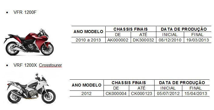3. Honda convoca recall das motocicletas VFR 1200F e VFR 1200X Crosstourer