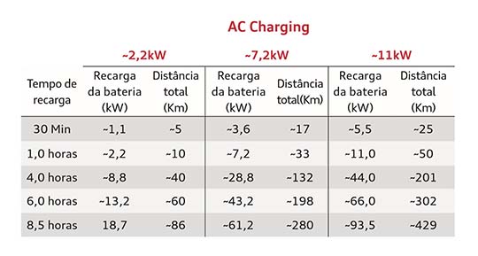 Vamos para o Audi e-tron. Ele permite uma recarga de até 11kW por hora em carregadores AC. Já para carregadores DC a potência máxima de recarga é de 150kW. O mais comum é que o cliente consiga ter em casa um carregamento de aproximadamente 7,2kW, sendo possível recarregar o e-tron de 0% a 100% em aproximadamente 13hs. No entanto, é muito importante frisar que o cliente pode carregar o veículo diariamente.