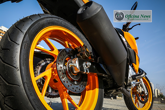 Parceiro de toda esta tecnologia aplicada aos freios das Honda CB 250F Twister 2019 é o conjunto formado por chassi, suspensões, rodas e pneus: tubos de aço compõe o chassi em arquitetura tipo Diamond, na qual o motor é elemento estrutural. A ele estão vinculadas suspensões telescópica à frente e monoamortecida atrás, cuja particularidade é ter a mola dupla.
